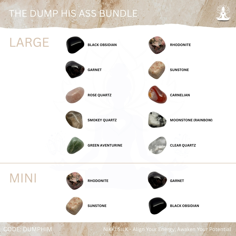 The Dump His Ass Bundle is intentionally created to cut energetic cords, restore confidence and reinforce deep, unwavering self-respect. Each crystal works in supportive alignment to encourage emotional release, strengthen personal boundaries and rebuild inner stability after disappointment, attachment or lingering emotional ties. Together they help clear residual energy, reduce rumination and stabilise self-worth from within. Ideal for stepping forward with clarity, independence and renewed strength, this collection empowers you to detach with dignity, reclaim your value and move ahead grounded, confident and emotionally self-led rather than externally defined.