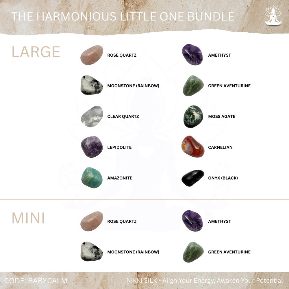 The Harmonious Little One Bundle is designed to surround newborns with soft, nurturing and calming energy, promoting emotional comfort and a peaceful environment to support healthy energetic development in early life. These crystals work together to soothe overstimulation, encourage calmness and create a secure emotional foundation, helping babies feel safe, settled and comforted throughout their daily rhythms. Each stone has been carefully selected to offer gentle protection, emotional grounding, peaceful energy and nurturing balance, and comes with guidance on its purpose, safe use and care, making this bundle ideal for both new and experienced crystal users and perfect for nurseries, sleep spaces or anywhere your baby rests and grows.