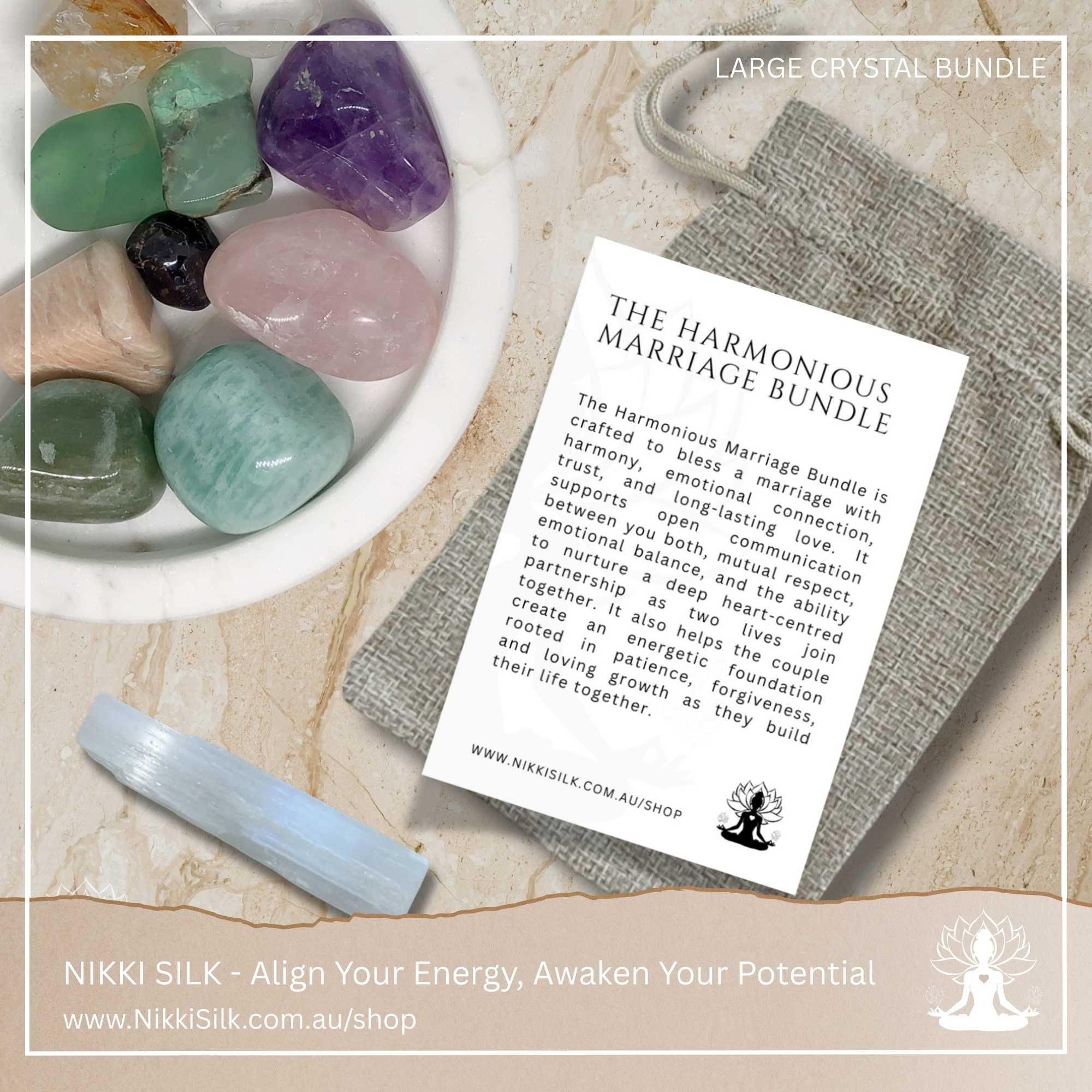 The Harmonious Marriage Bundle is designed for newlyweds and couples beginning married life together, supporting love, harmony and emotional connection as two lives unite. This carefully curated selection of crystals works together to encourage open communication, emotional balance, trust and long-lasting partnership, helping couples build a strong, heart-centred foundation rooted in mutual respect and shared intention. Each stone has been thoughtfully chosen to nurture love, unity, patience and emotional understanding, and comes with guidance on its purpose, use and care, making this bundle ideal for newlyweds, wedding gifts or couples wishing to consciously bless their marriage with positive, supportive energy.