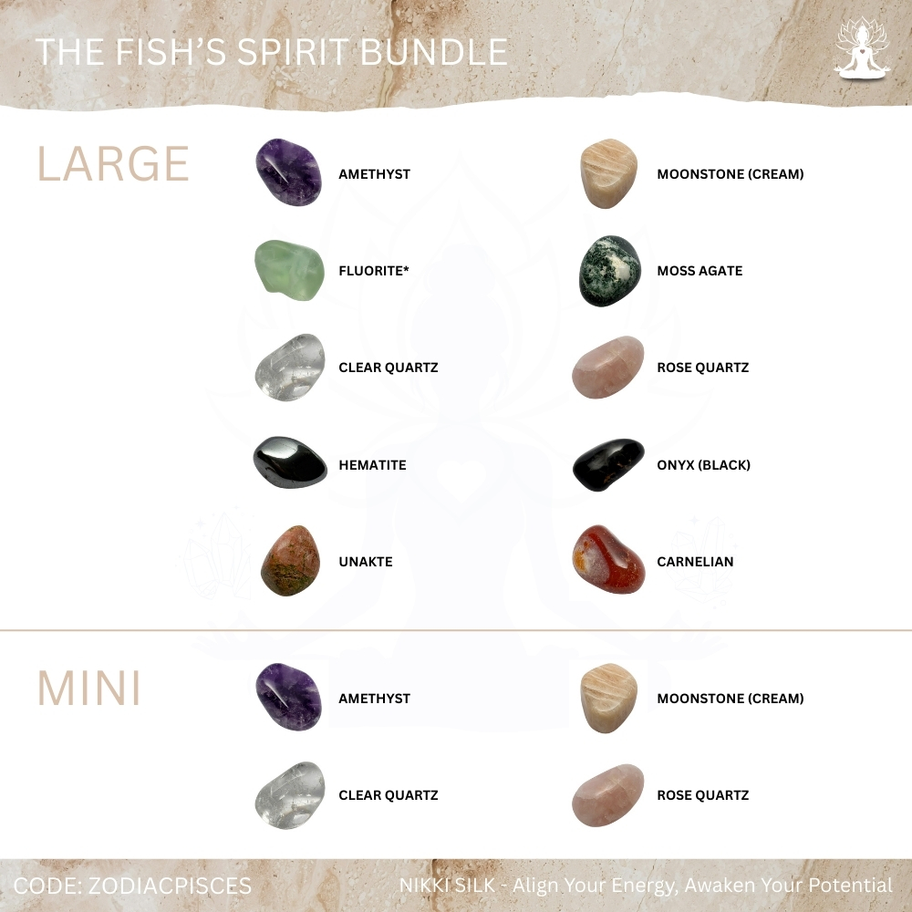 The Fish’s Spirit Bundle is designed for Pisces’ intuitive, imaginative and deeply sensitive nature, supporting spiritual clarity, emotional balance and a gentle inner flow while helping you stay grounded between the physical and mystical realms. Because Pisces feels life with great depth yet can experience overwhelm or boundary challenges, these crystals work together to soothe heightened emotions, strengthen intuitive wisdom and support grounded sensitivity, making the bundle perfect for Pisceans seeking peace, emotional steadiness and spiritual alignment. Each stone has been carefully chosen to enhance creativity, spiritual connection, emotional healing and intuitive confidence while providing grounding and energetic protection, and includes guidance on its purpose, use and care, making it ideal for both beginners and experienced crystal lovers.