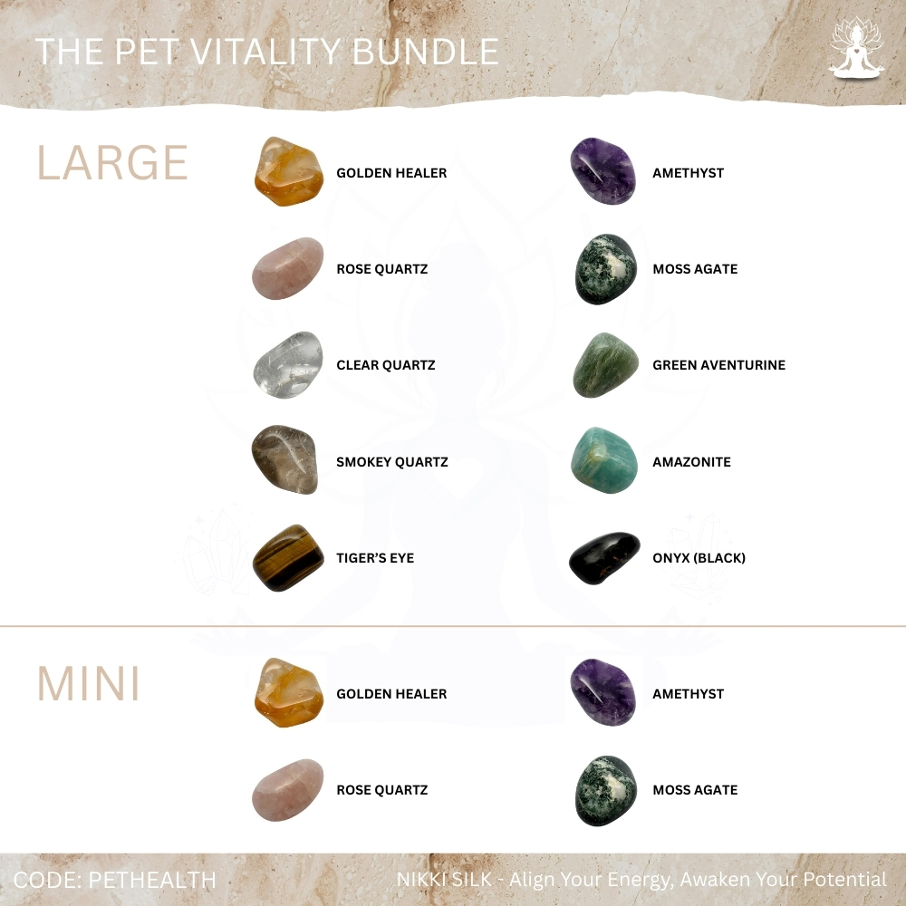 The Pet Vitality Bundle is designed for pet owners wanting to support their cat or dog’s physical health, mobility and overall wellbeing through gentle, balanced energetic care, helping maintain grounded vitality and natural healing. These crystals work together to promote endurance, circulation and nervous system balance while uplifting vitality and clearing stagnant energy, helping pets feel stronger, more centred and energetically aligned. Each stone has been carefully chosen to offer grounding, clarity, physical support and calm, and comes with guidance on its purpose, safe use and care, making this bundle ideal for both new and experienced crystal users and perfect for pets needing ongoing wellness support, ageing animals or any furry friend who benefits from holistic care.
